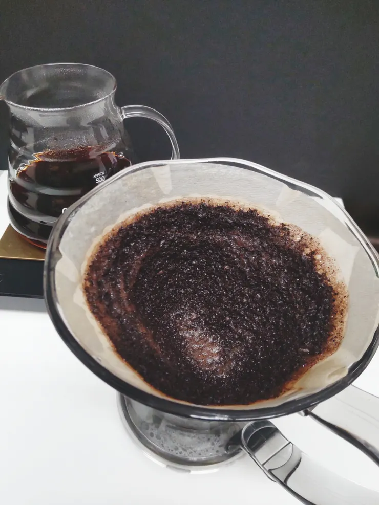 抽出後のペーパーはコーヒー粉の分厚い壁!。立山黒部の雪の大谷に行きたくなるの図です。いえ、ガスが邪魔をしてお湯とコーヒー粉が触れ合えないの図でしょう。