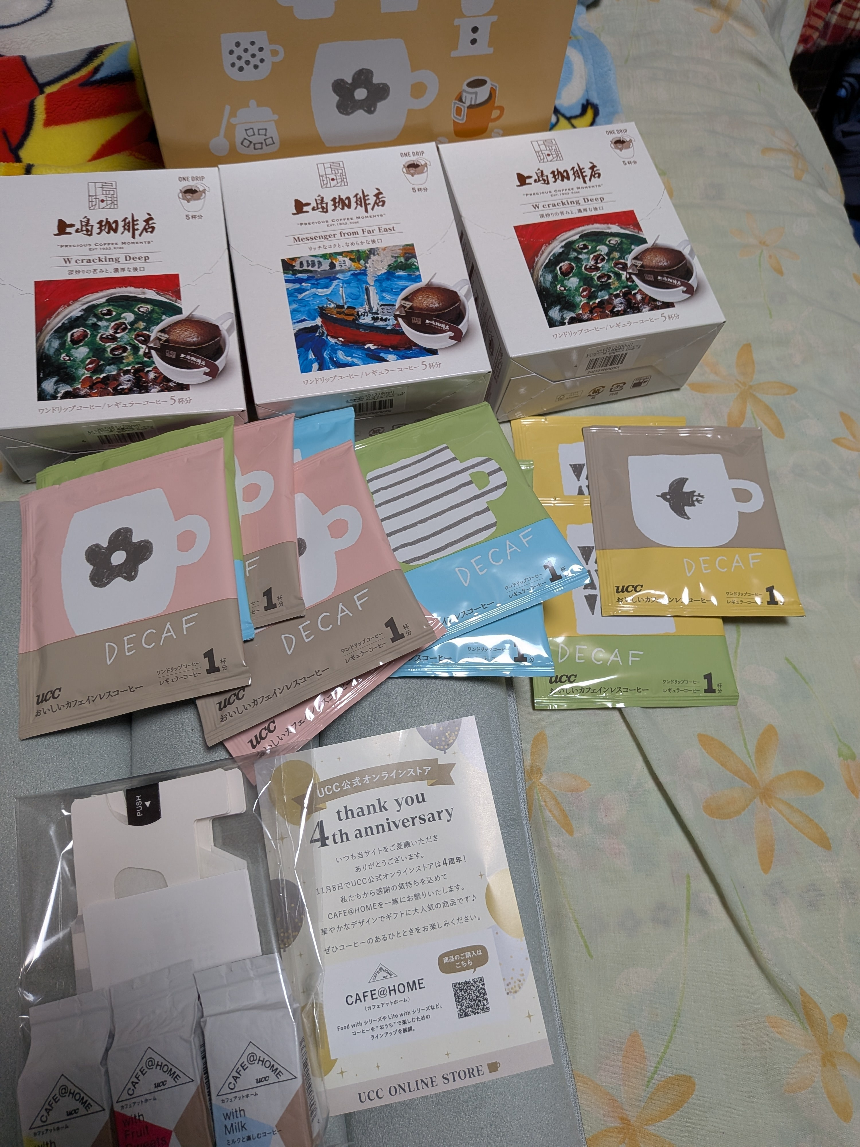トップ > コーヒーギャラリー > 今日の一杯 > オンラインストアで購入 みっぴー 2025/11/09 19:51 オンラインストアで購入 デカフェ50袋買いました!他に10グラム入りの上島珈琲店3箱。每日の職場で飲むものは、夕方はデカフェにしています。 UCCラボ全国研究プロジェクト いいね 共有する 共有する X facebook LINE リンクをコピー コメントする 1 件の返信 (新着順) ミュートしたユーザーの投稿です。 投稿を表示 oyakata 2025/11/10 08:07 すごい、沢山いろんな種類買ってうらやましい。 職場で好きなコーヒー飲んで、リフレッシュできるなんていい環境ですね。 いいね 返信する ミュートしたユーザーの投稿です。 投稿を表示 みっぴー 2025/11/10 08:30 oyakata ありがとうございます。そうか、良い環境なんだ〜!とありがたく思いました☆デカフェの箱入りは初めて買いました。いろんな柄ですが、種類は一つだと思います。手前のものはおまけです。オンライン4周年ということで。ユーシーシーオンラインの宣伝になりました。送料無料にするためにたくさん買いました。 いいね 返信する