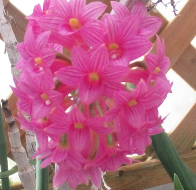 トップ > コーヒーギャラリー > 今日の一杯 > ベニバナセッコク たまのり 2026/03/01 05:11 ベニバナセッコク セッコクの隣にあった ベニバナセッコク。 世界らん展で大賞受賞したこともあるもので 小花がボール状に咲きます。 香りはありません。 節のある茎状のバルブをまっすぐに伸ばします。 表面の土が乾いたら水やりを。 開花中は花にも霧吹きで葉水をあげると 長持ちするそうです。 花柄摘みが大切。 花茎から摘み取ります。 ただバルブはカットしないことと、書かれていました。 ******** いいね 共有する 共有する X facebook LINE リンクをコピー コメントする 4 件の返信 (新着順) ミュートしたユーザーの投稿です。 投稿を表示 ぽちお 2026/03/02 07:50 着色されたような鮮やかなピンクですね(^^♪ 甘い香りがしそうなのに香りがないなんて! いいね 返信する ミュートしたユーザーの投稿です。 投稿を表示 たまのり 2026/03/02 08:21 ぽちお おはようございます。 今日は早い! たぶんセッコクの仲間だから 香りがしないのかなーと 思っています。 セッコクは育てたことがあるので。 きれいな色ですよね。 画像は明るくはしていますが 色調はいじっていませんので。 いいね 返信する ミュートしたユーザーの投稿です。 投稿を表示 うっしっし 2026/03/01 15:55 ピンク🩷が可愛い😍 いいね 返信する ミュートしたユーザーの投稿です。 投稿を表示 たまのり 2026/03/01 16:36 うっしっし なんともかわいらしい色合いですよね。 南国の蘭と違って 日本や中国などのセッコクの仲間なのだそうです。 いいね 返信する ミュートしたユーザーの投稿です。 投稿を表示 イエティ 2026/03/01 12:47 わあ~きれいですね。 きれいな花をみるだけで気持ちよくなりますね。 いいね 返信する ミュートしたユーザーの投稿です。 投稿を表示 たまのり 2026/03/01 13:48 イエティ イエティさんも 本当に植物の好きな方ですものね。 いろいろ知ると 仲間のような感じになります。 植物の方がたくましいですが。 いいね 返信する ミュートしたユーザーの投稿です。 投稿を表示 トマト 2026/03/01 10:18 きれいですね🌼 一つ一つの花を見ていると何か別の花に見えてきて不思議です。 いいね 返信する ミュートしたユーザーの投稿です。 投稿を表示 たまのり 2026/03/01 13:46 トマト きれいなランに心癒されますね。 いいね 返信する