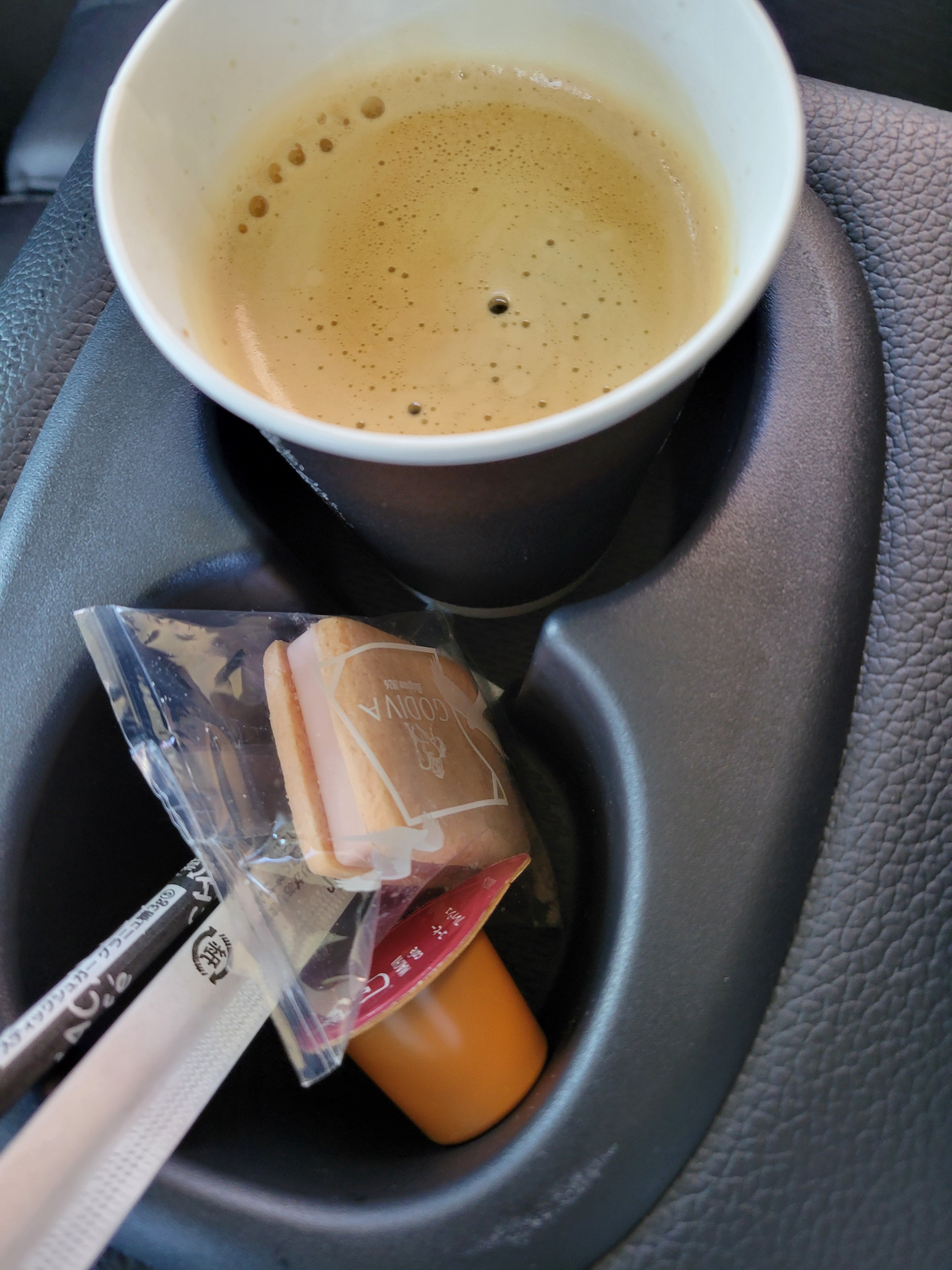 天気がよく、お花見に出かけました。途中のコンビニでコーヒーを買い、車の中でいただきました。