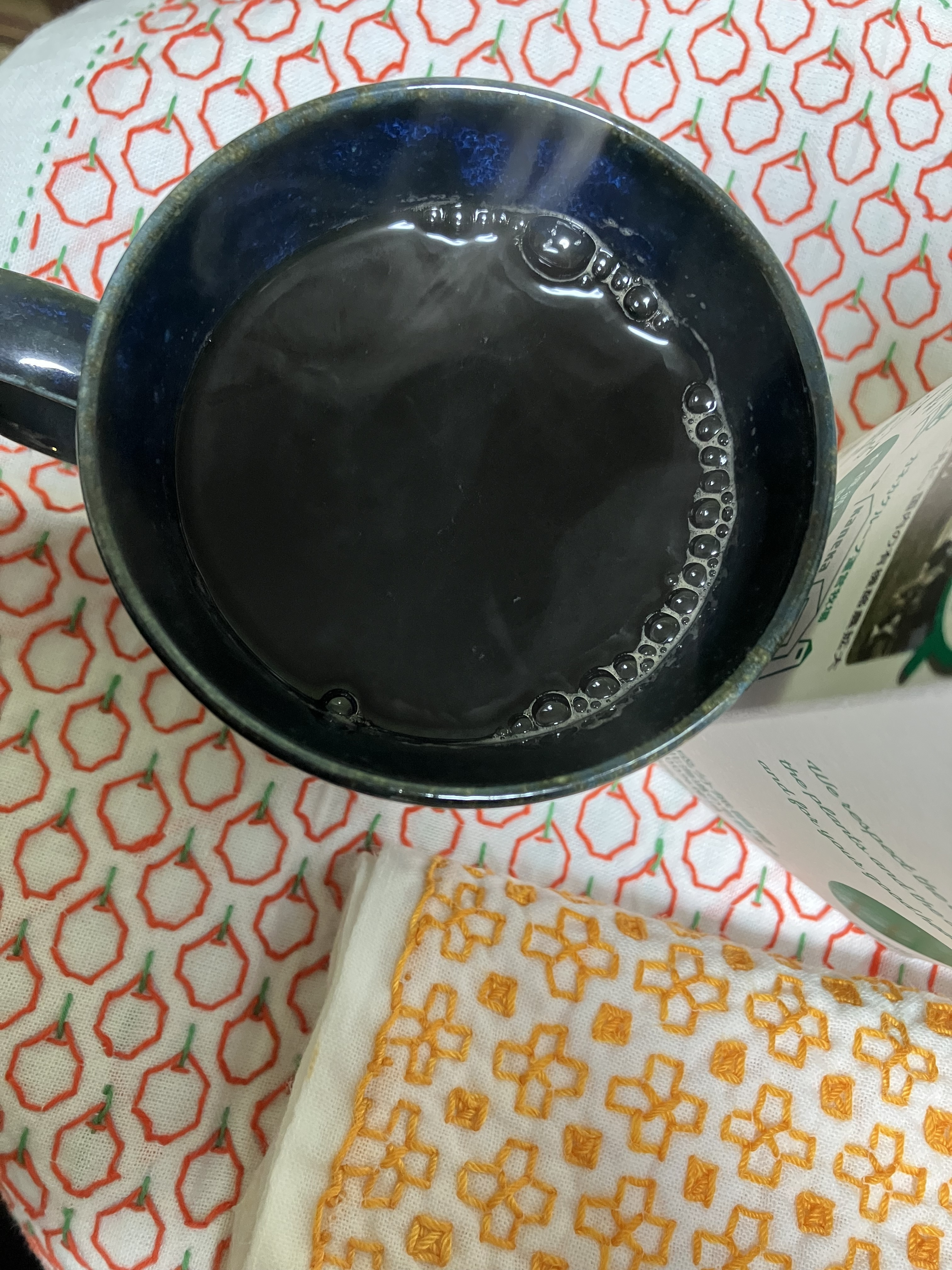 昨日行った女子大のバザーで購入した刺し子布巾を敷物に。