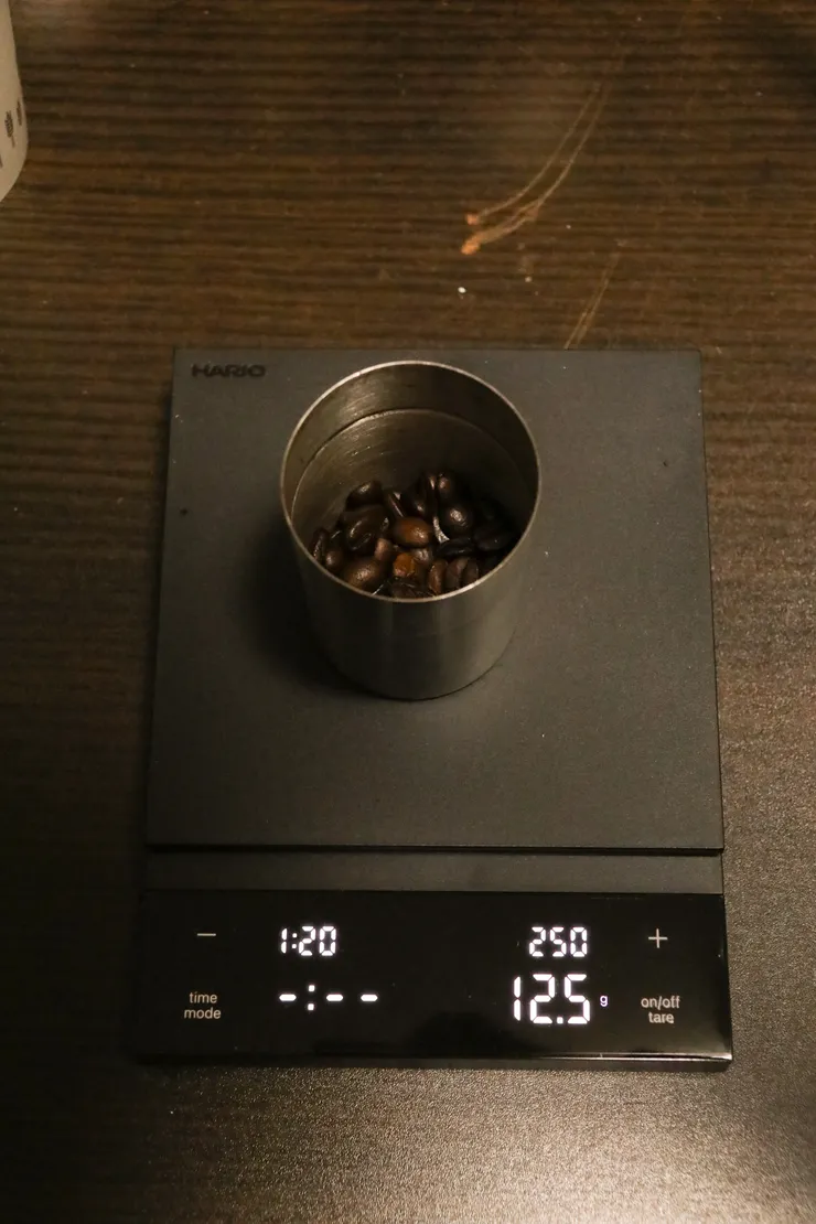 スケールの右上の湯量が250gになるように粉を入れてます。(写真を撮り忘れたので豆で撮り直し)