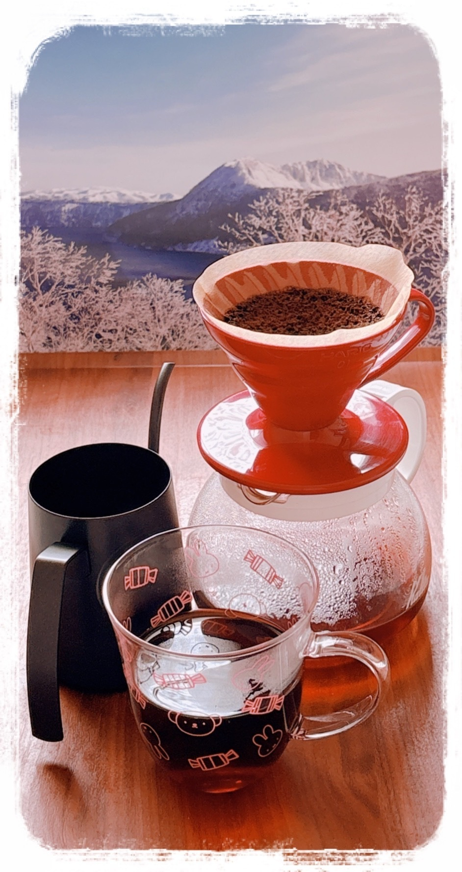 📎珈琲(粉):メジャースプーン2杯 、お湯:400ml、ドリッパー:HARIO V60 透過 コーヒードリッパー、細口のドリップポット使用