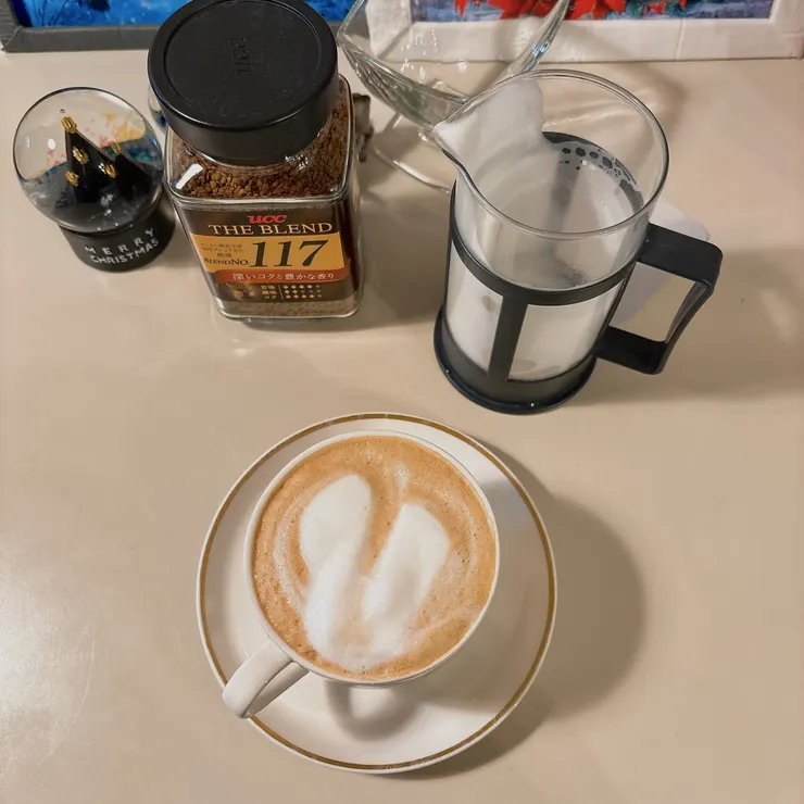 スチームが無いので、温めたミルクをハンドフォームしピッチャー代わりのプレスで注ぐ…笑