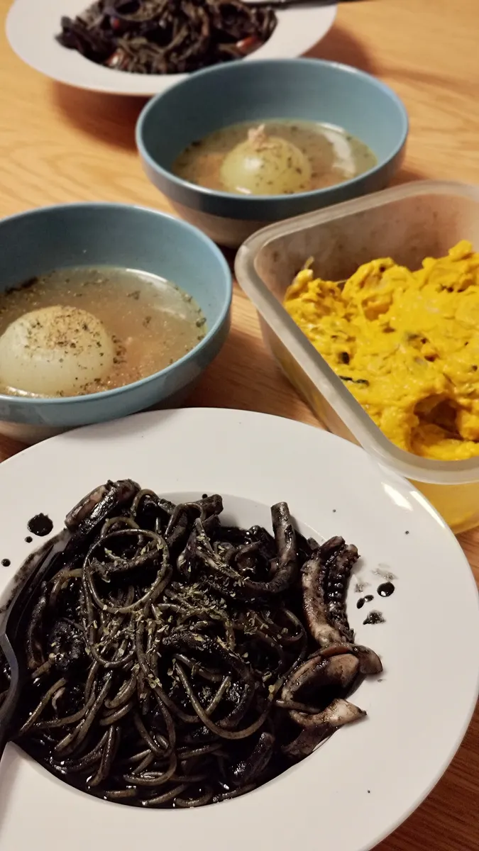 イカスミパスタと鶏もも肉の梅和え煮おいておきます