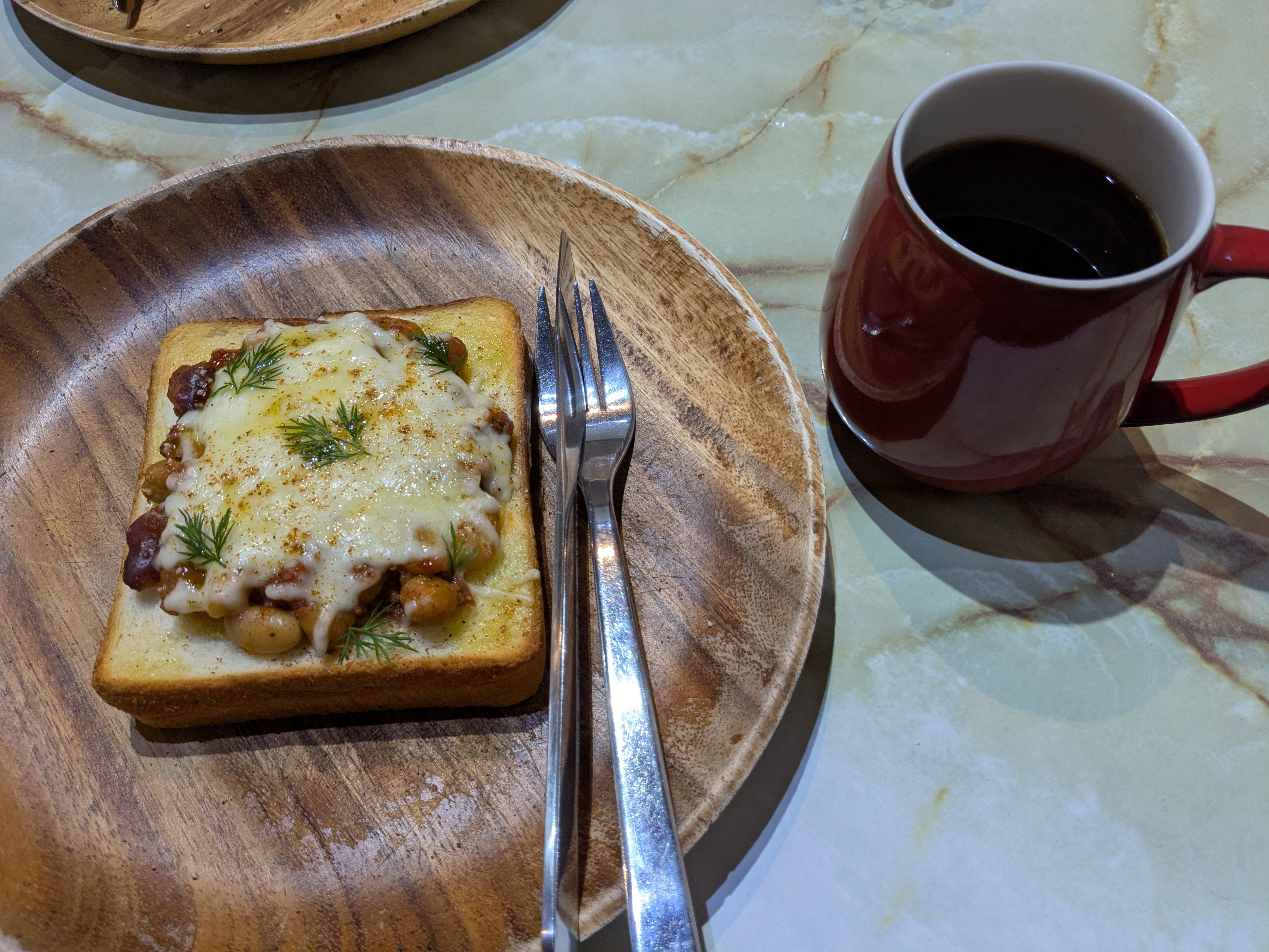 チリビーンズのトーストとの一杯☕です。