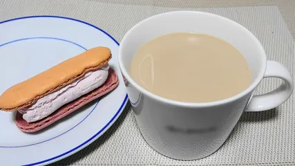 私も昨日、苺のマカロンとカフェオレを仕事帰宅後にいただきました♪遅い昼飯用意前に(笑)