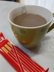 朝の家事を終えて、○ッキーとカフェオレを飲みました。