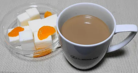 みるく寒天と 今日の仕事後のオヤツは、カフェオレと「みるく寒天」です。「みるく寒天」は素朴な味で、美味しいです♪