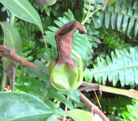 食虫植物とコーヒーの蓋 Yさんはわかったようです。 私は何度かこの温室に来ていますが食虫植物のコーナーはスルーして一度も足を踏み入れていません。 「たまのりさん、これみてください」上手に誘われました。 つぼのようなもの。 「中に虫が入ったら、口を閉じて、蠕動運動でもするのですか?」な