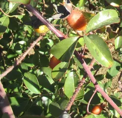 ナニワイバラとコーヒー 「触ってみてください」と言われておそるおそる手を出しました。 毎日針で指を突っついているんだから痛くはないわよ。 なんというか、とげですね。 これが中国から来たバラの原型の一種なんですね。 ローズヒップのあるバラ園には「バラの実を持ち帰らないようにお願いします