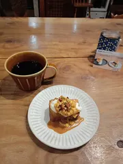 カフェでのひととき☕コーヒーマグという通常サイズの倍量です。たっぷりのコーヒーととびっきりに甘いキャラメルナッツのチーズケーキ。 たっぷりのコーヒーがあるあいだはいろんなことに思いを馳せながら☕