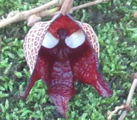 「たまのりさん、あしもとに!」 キャッ! 何だろう、何がいるんだろう。つる性の植物に花がついていました。 「アリストロキア・サルバドレンシス」エルサルバドル原産なので、こういう名前がついたそうです。 花の大きさは、4~5cmくらい。 それが、なんとも