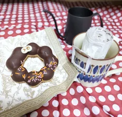 クラッシクブレンド蒸らし30秒で 仕事終わりのコーヒーブレイクはミス〇のハロウィーン仕様のポン・デ・リング♪ドーナツでコーヒーに最も合うのはチョコファッション(いちばん好きなのです😆)でしょ!…と内心密かに思っていたのですが、このポン・デ・リングとコーヒー(ブラック)、おいしいの相乗効果抜群…✨やっぱりチョコレートがポイントでしょう