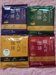 職人の珈琲 ワンドリップコーヒー 1杯分4種セット (深いコクのスペシャルブレンド/あまい香りのリッチブレンド/まろやか味のマイルドブレンド/ビターな味わいのクラシックブレンド)届きました。前は緑を飲んでいて今は青の飲んでいて今回黄色を飲んで「これ好き」と思いました。飲んで比べて面白い時間ありがと