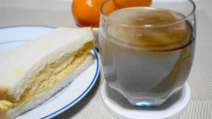 まだ氷抜きで 今日の朝食は、アイスラテとタマゴサンドです。日中は気温が上がりますが朝はまだ肌寒いので、氷抜きです。