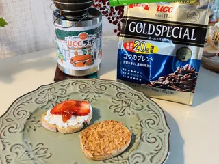 久しぶりの手裏剣トースト、全粒粉入りパンだからオールしっとりではなくて割れちゃいました🥷枇杷のじゃむと作ったクリームチーズを添えて