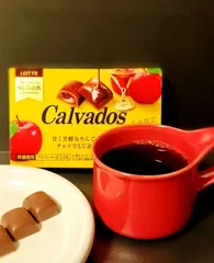 カルヴァドス(お酒)入りチョコと イエローの箱に真っ赤なリンゴが描かれた印象的なパッケージに惹かれて購入しました。 リンゴのお酒🍸カルヴァドスのシロップ入りチョコ。パッケージを開けたとたん、洋酒の香りがふわっと漂いました✨ コーヒーは、UCCゴールドスペシャル コクのブレンド。洋酒入りのチョコとコーヒーも大変おい