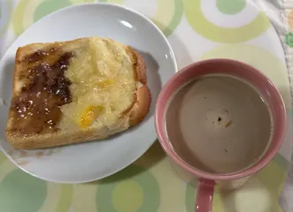 ホームベーカリーで焼いたパンとコーヒーで朝食。