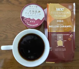 UCC GOLD SPECIAL PREMIUM メロウキャラメルでまったり 先日当選したメロウキャラメルと一緒にあずきアイスを食べました挽いた豆の香りとともにゆっくりコーヒーを味わって至福のひとときを過ごしました
