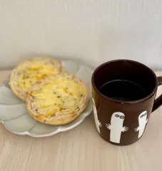 朝食の一杯☕️ 今朝はイングリッシュマフィンにバター、チーズ、マヨをのせてこんがりトースト🍞