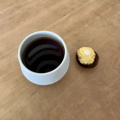 チョコが美味しい このコップ、実際に見るところんとしていてかわいいのですが、、。写真映りが悪く活かしきれない。悔しい横からだと珈琲見えないし( ̄▽ ̄;) 横に添えてあるのはフェレロ ロシェ。とても美味しかった