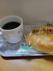 今朝のコーヒー チーズがゴロゴロ入ったパン。食べ応えありました(о´∀`о)