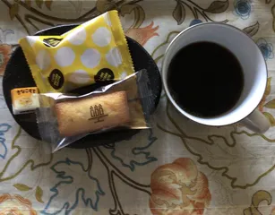 お土産のお菓子とブラックコーヒーで早くもおやつタイムです今日は午前5時起床主人と6時朝食そして9時にはおやつタイム(笑)です