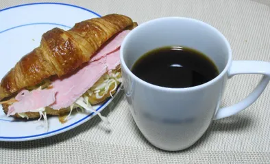 クロワッサンサンド 今日の朝ごはんは、買ってきたクロワッサンに野菜とハムを挟んだクロワッサンサンドにしてみました。合わせるコーヒーは、マンデリンブレンドにしてみまいた。エチオピアの香りと、マンデリンのコクがあって美味しいです。