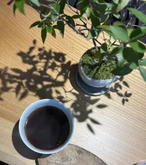 久しぶりにカフェへ。盆栽を見ながら飲むコーヒーはまたひと味違っておもしろい。影を作るためにライトの位置は、考えられて設置されてるそうです。