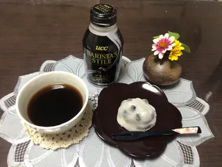 豆大福とアイスコーヒー 京都のお土産の豆大福❤️お豆に塩味が程よくあり、少し硬めで甘い大福と合う〜😋 お抹茶がいいかなと思ったけど、家族にアイスコーヒー☕️と言われたのでUCCの缶コーヒー、バリスタズスタイルのブラックと一緒に美味しく頂きました😊