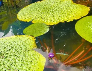 オニバスとコーヒー レッドリストに載る「オニバス」スイレンの仲間です。きれいな紫の花が咲いていました。水の中には蕾のような閉鎖花がいっぱい。数年から数十年休眠して、咲くという性質があるのだそうです。 葉っぱの表面には、とげがあります。「痛いですから、触れないでください」と注意書きがされていますがす