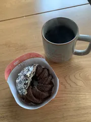 ミスドとGODIVAコラボ 今日はドゥショコラパイ今日のコーヒーは上島珈琲店 のMessenger from far East先日行ったらGODIVAコラボ1品もなかったから終わったのかと思ったら今日はあったので今日はショコラパイを🥧ミスドはパイが1番好きなんだけど入ってる2種類のショコラクリームが