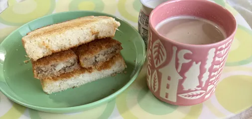 昨夜のコ〇ちゃんコロッケ一つ残っていたトースターでパンを焼きコロッケも焼いた カリカリした食感とじゃがいものほっくり感土曜の朝のコロッケパン^^ カフェオレとヨーグルト🥄 今日の花粉は酷くて、花粉症再発!?とりあえず目を洗いました(・ __・)꜆