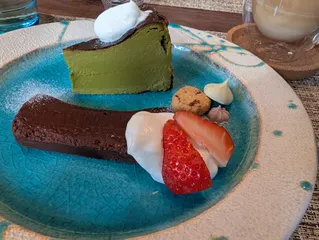 チーズケーキの美味しいお店 時間限定のデザートプレート抹茶チーズケーキ ショコラテリーヌこのお店のコーヒー カフェオレが美味しいです