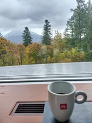羊蹄山を見ながらモーニングコーヒー 美味しいモーニングを食べて、羊蹄山を見ながらコーヒータイム。illyの大きいマグカップが可愛い☕眺めがよくてずっとここにいたい😊