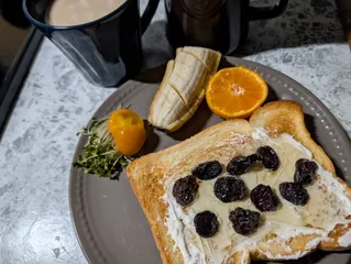 ヨーグルトから作った手作りクリチでクリチ レーズン ハニートースト🍯🍞 今日はカフェオレです☕