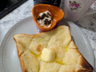 SNSで見たパン焼く前に水道水をさらっとかけて焼いたら驚くほど美味しいというトーストやってみました水道水かけすぎたのかパンぼとぼと😆なかなか焼けなかった 失敗でしたがまぁ美味しく食べれました😅リベンジしよー #モーニング #トースト #おうちカフェ